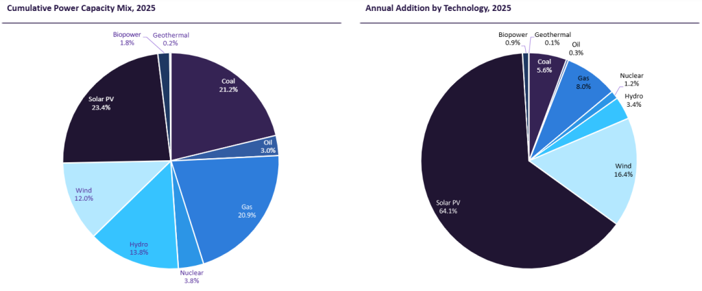 Gas and coal accounted for modest shares (8% and 5.5%, respectively) of new capacity additions in 2025. The reality is: thermal power is losing ground. Equally true, however, is that it is still far from gone. For now, gas power in particular will retain a foothold as a lower-emission fossil option that can balance power systems as they race to modernise.