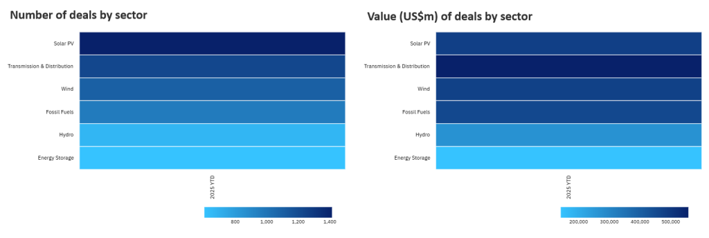 In terms of sector, solar PV deals came out on top with 1,412 transactions totalling roughly $480.2bn. However, the largest share of capital ($557.3bn) flowed into T&D, which saw fewer deals (1,223), reflecting the large-scale and capital-intensive nature of T&D projects, as well as the vitalised global focus on upgrading grid infrastructure.